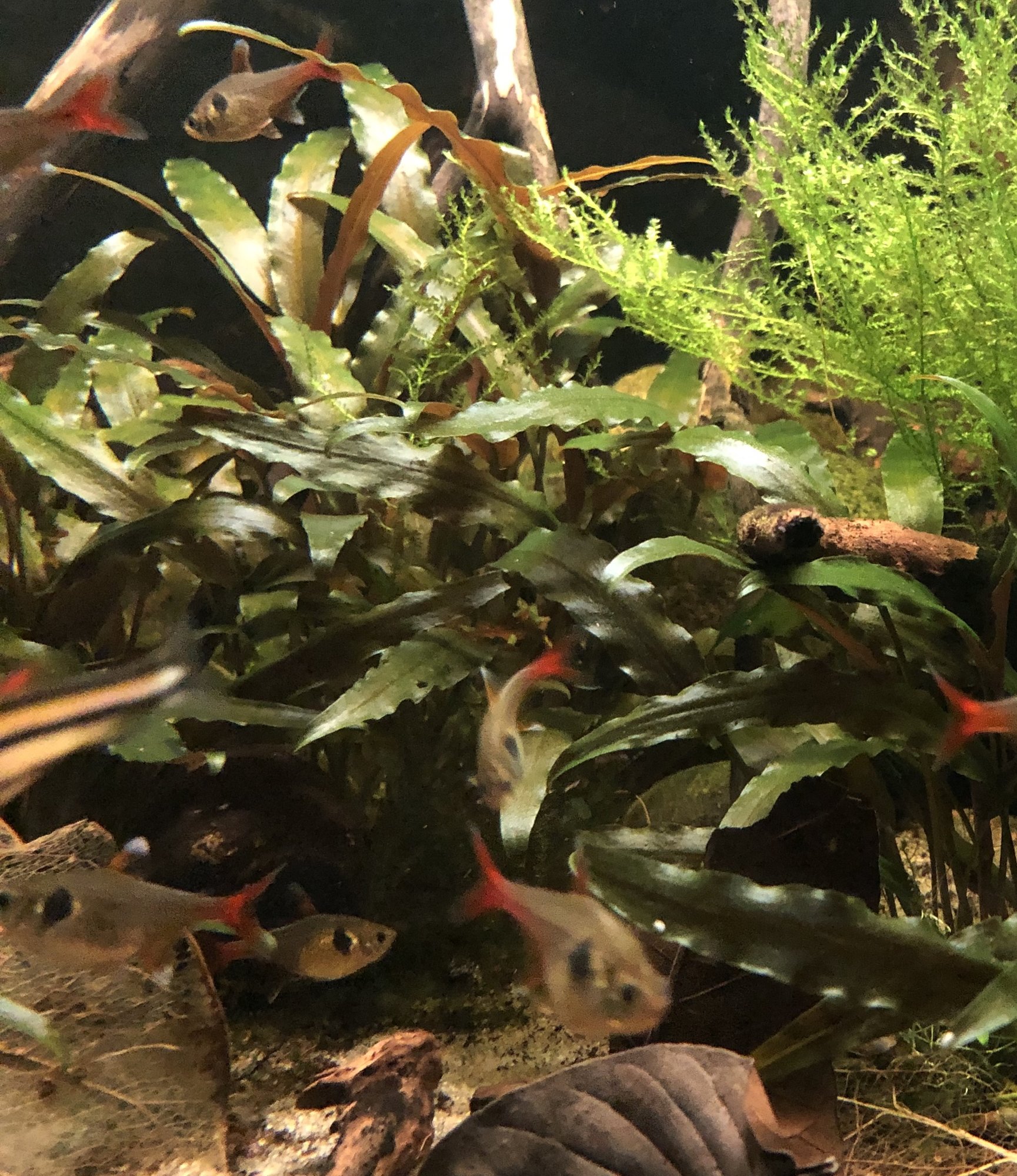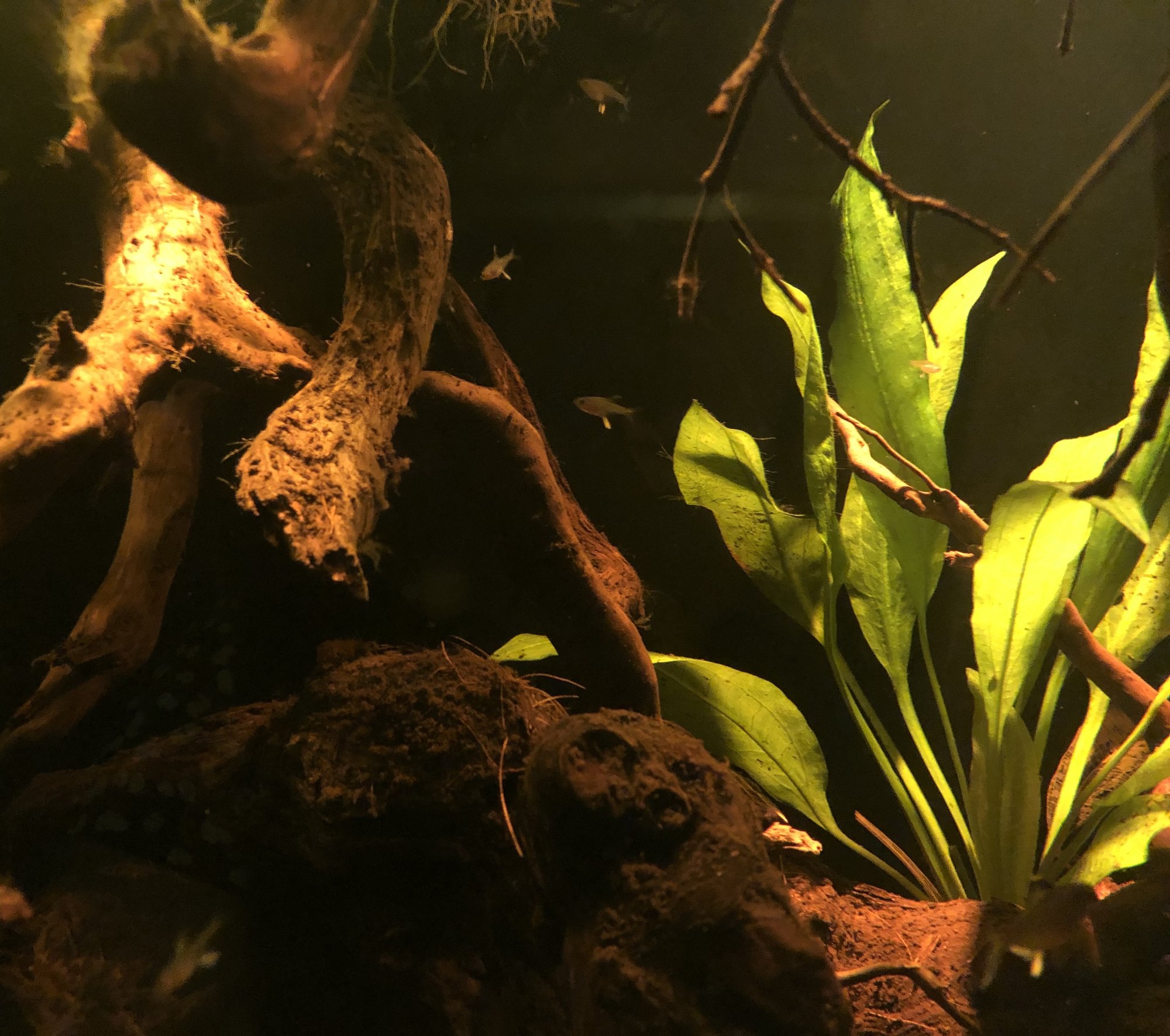 I lillkaret såg jag det pyttelilla kolglödstetraynglet igen. Det är så litet att det inte simmar fritt med de andra än utan håller sig gömd i mossan bland några rötter. Jättesött är det!