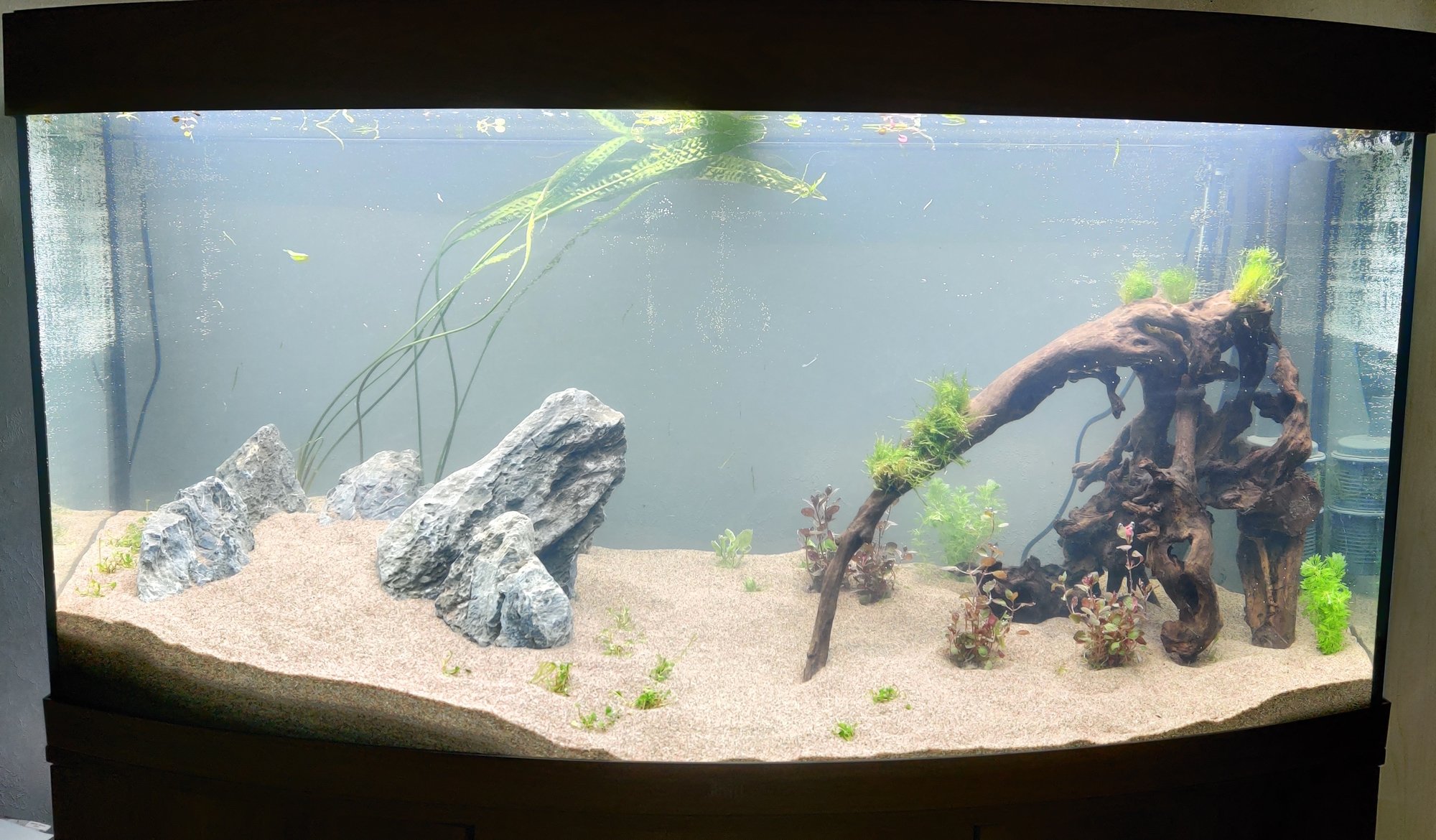 Du har ju inte mycket eller stora växter just nu och då är det svårt att få till inredningen så där riktigt bra. En bra utfyllnadsväxt som jag älskar och i mina två akvarier är jätte anubias, den är fantastisk, bara lägga den mot botten utan att förankra den och vips