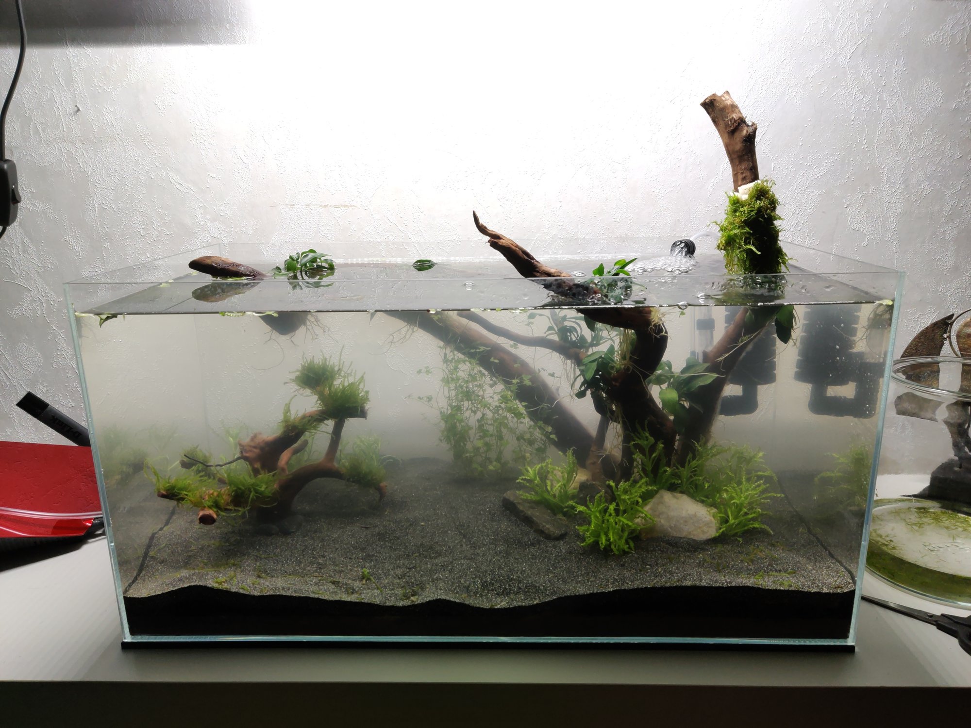 . Det man får tänka på med rötter som går över ytan och sticker ut eller vilar mot gaveln på akvariet är att iaf. Amanoräkor gärna klättrar ur karet. Annars ser det bra ut redan, fyller du på med mer växter också som du planerat blir det grymt.