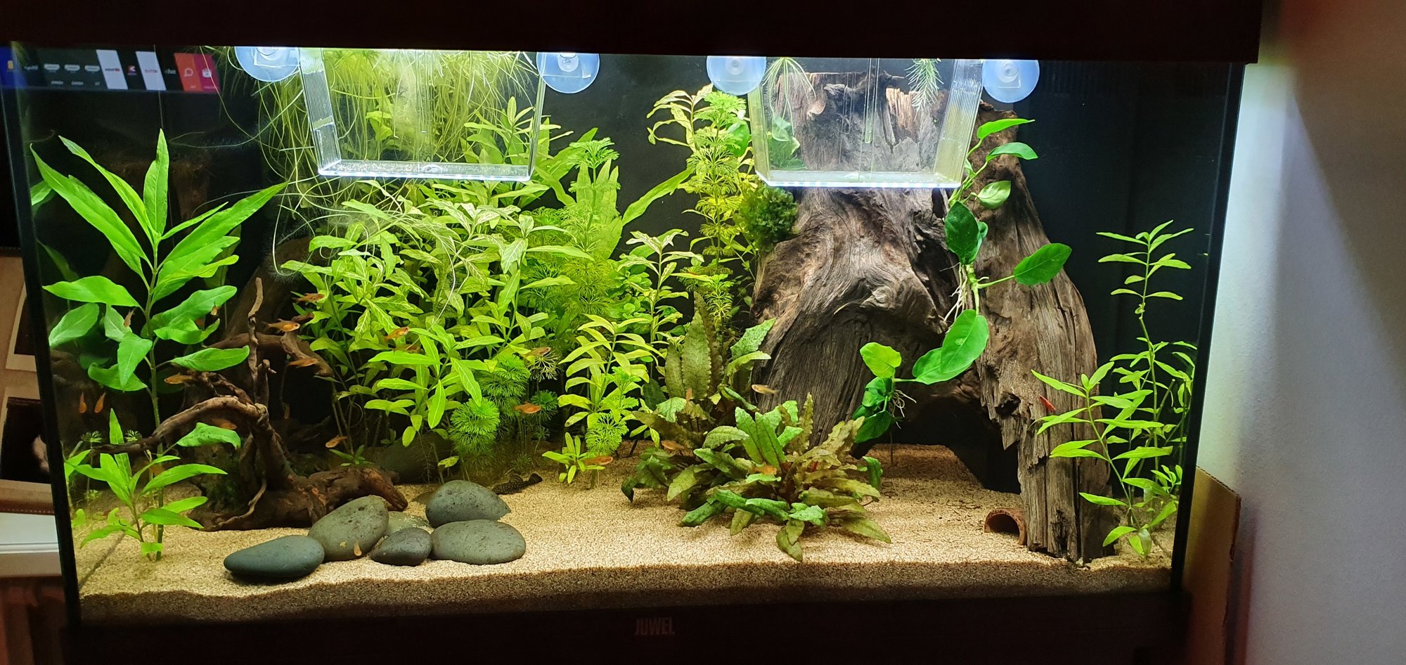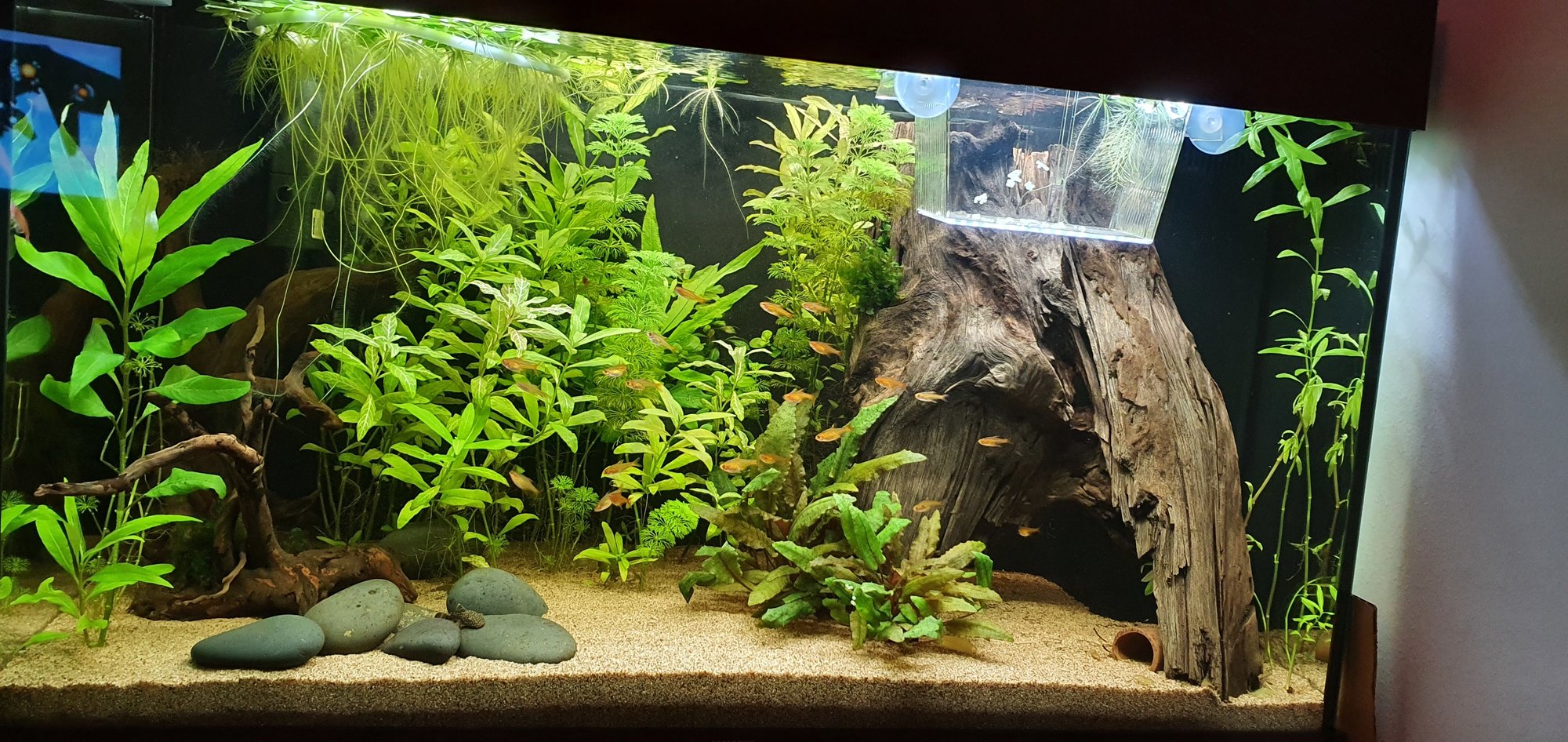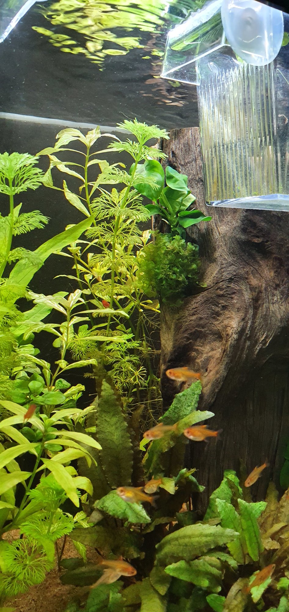 Jättefint kar du fått till. CO2 har två sidor. För att fortsätta hålla fint kar krävs stabilitet. Du har det nu men med CO2 så behöver det alltid rulla på lika, gasen ska pytsas ut jämnt och tuben ska inte råka ta slut. Över tiden varierar det, speciellt på sommaren är det lätt hänt. Vissa växter blir rent av fulare med CO2. Det jag tycker fungerar bättre (stabilare än CO2) är luft(finns ju CO2 i luften) i utsläppet från filtret (vilket i ett litet kar är trixigt om vattnet är hårt då det kalkar på lysrören) Men framförallt, tillräckligt med ljus. Ser att CO2 används för att kompensera för dåligt med ljus.https://www.zoopet.com/forum/showthread.php?t=159029