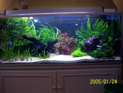 Du skulle kunna fylla ut det tomma utrymmet längst bak i mitten med nån sorts hygrophila. Dom blir väldigt snygga och finns i lite olika utföranden och färger. Sen skulle du ju kunna täcka botten längst fram med glossostigma eller nålgräs eller nåt, men jag vet inte. Det är rätt snyggt med den där vita botten.