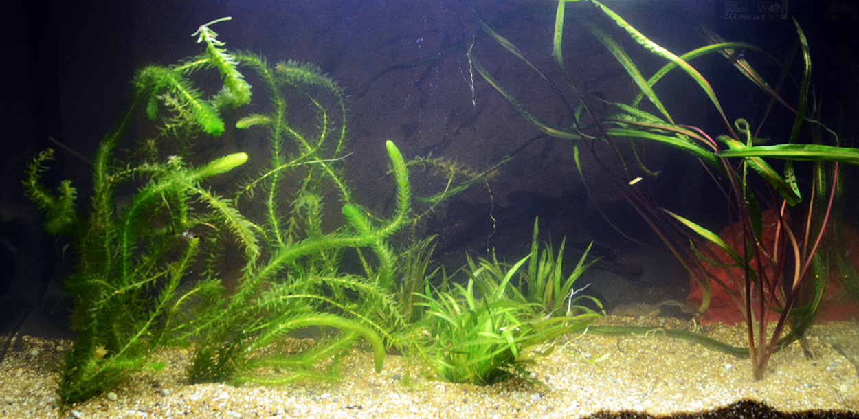 Jag köpte nämligen på mig en del växter på GCG-auktionen som jag inte hade plats för. Att jag köpte dom berodde helt enkelt på att jag behövde få dessa växtarter fotade så jag la Aquapad på botten av akvariet (så det sakll gå snabbt att riva ut gruset igen). Slängde på en del grus som jag hittade i garaget i akvariets framkant, fyllde på med vatten och i med växterna - från vänster är det Elodea canadensis, Sagittaria platyphylla och Cryptocoryne balansae.
