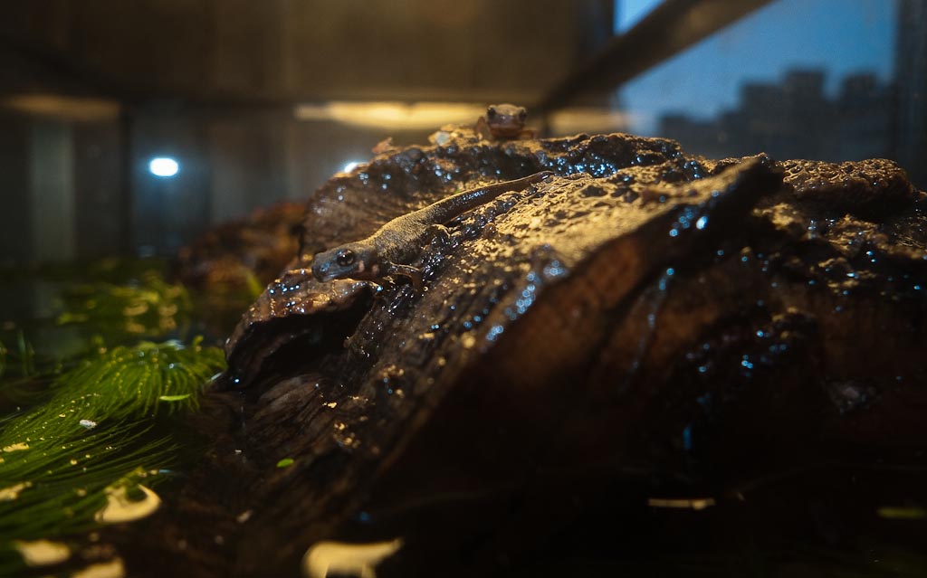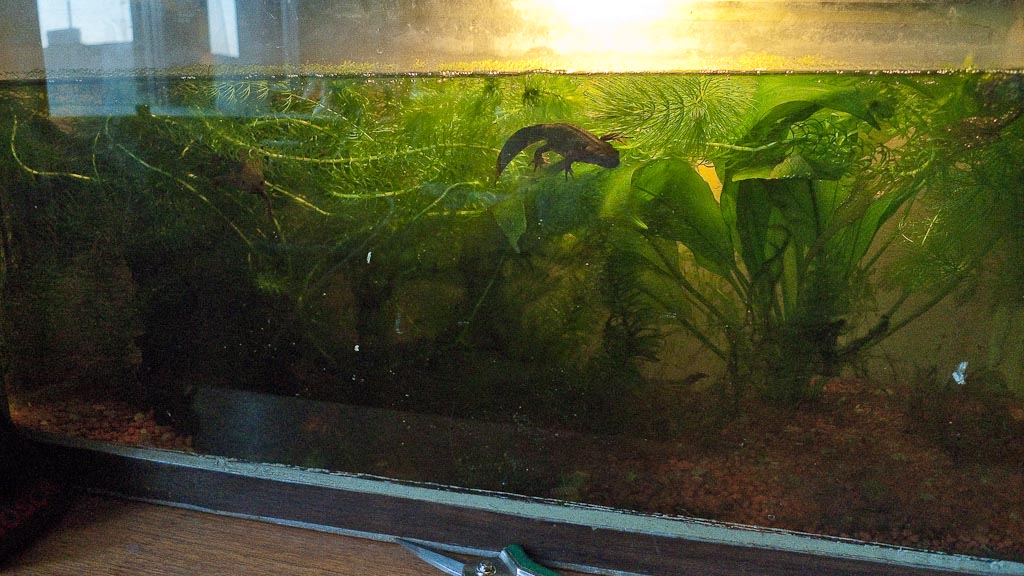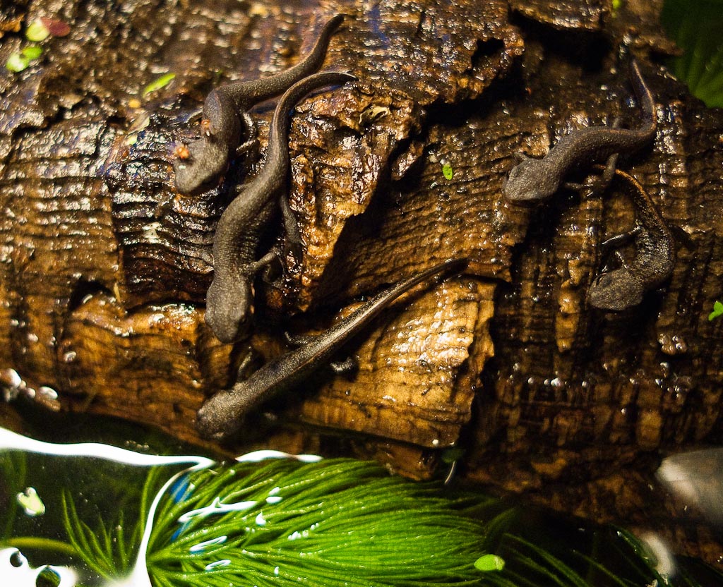 Cirka en tredjedel av ungarna har kvar gälarna och är kvar i vattnet. De som metamorfoserat sitter på den flytande korkbarken. Vissa gömmer sig under ett kokosnötskal, vissa är framme i ljuset. Jag ska snart prova att flytta dem till ett torrt terrarium.