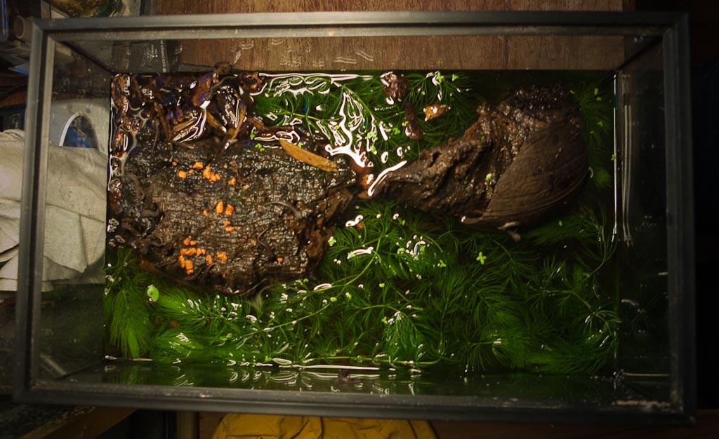 Jag har mina i 45 liter och de verkar trivas. I ett 500 liters blir det väl svårt att hitta dem? För du har väl inga fiskar eller andra amfibier i det också?