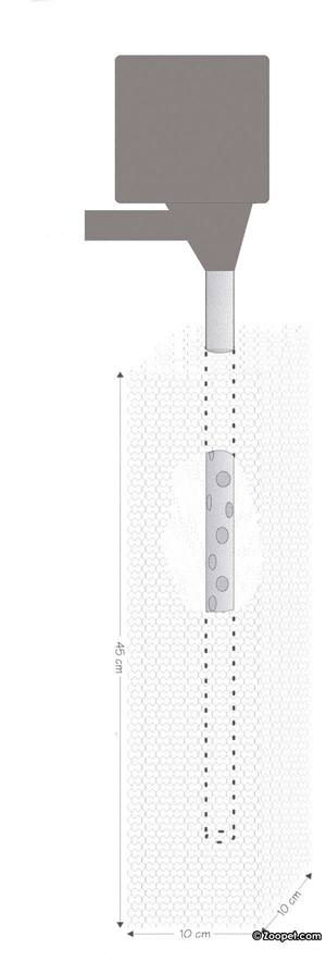 Skiss på det färdiga resultatet. Fördelen med detta filter är att filtermaterialet är så stort att det bildas ett effektivt biologiskt filter som i ett normalbefolkat akvarium bara behöver göras rent en gång om året. Nackdelen är att det tar större plats i akvariet, men i gengäld är det ju lättare att gömma det bakom stenar, rötter och/eller växter eftersom man bara behöver plocka ut det en gång om året för rengöring istället för en gång i veckan som annars är normalt.