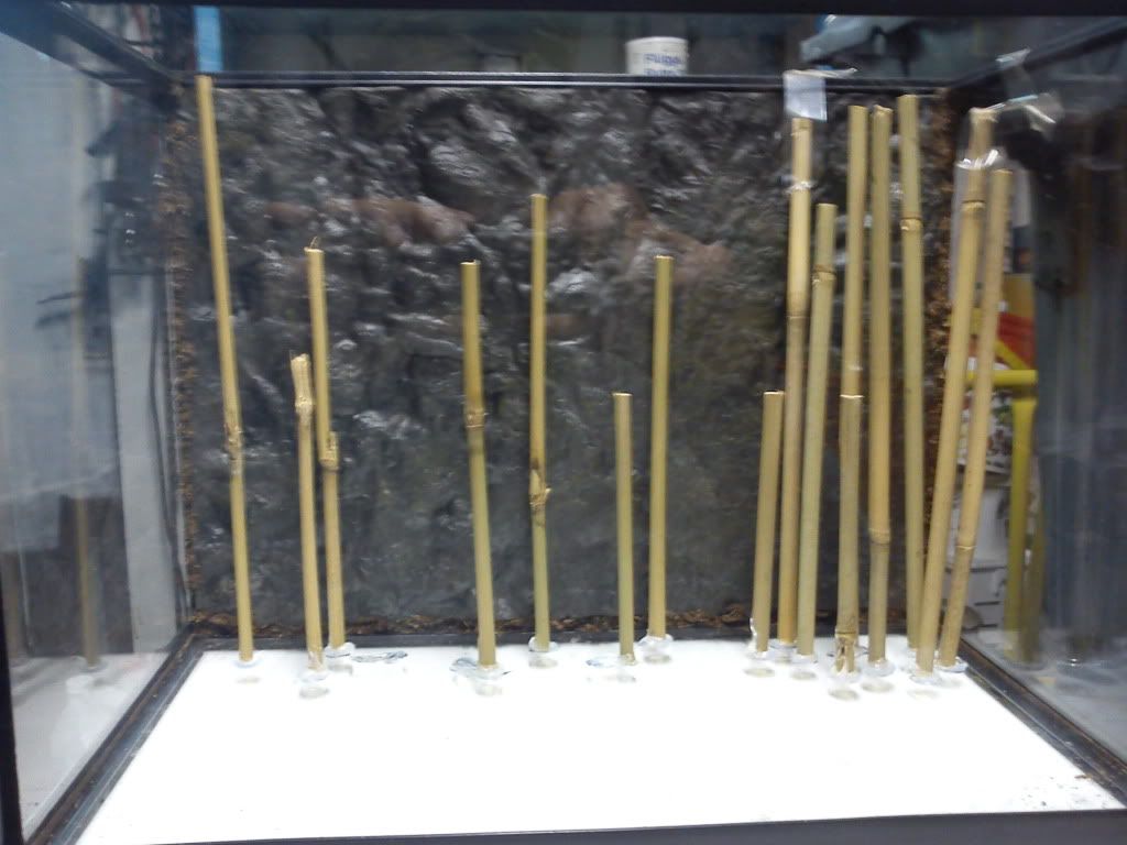 har limmat bakgrunder i akvarierna idag, blev en svart typ slimline bakgrund i 2st och kork i 1.