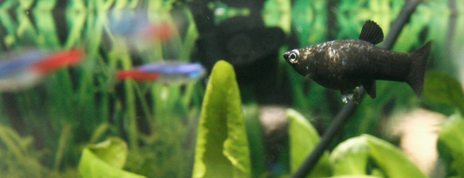 Angående färgen så håller jag med om att det är en blandras. Antingen med dalmatin eller med silver molly. En "renrasig" black molly har helsvarta och mindre ögon.