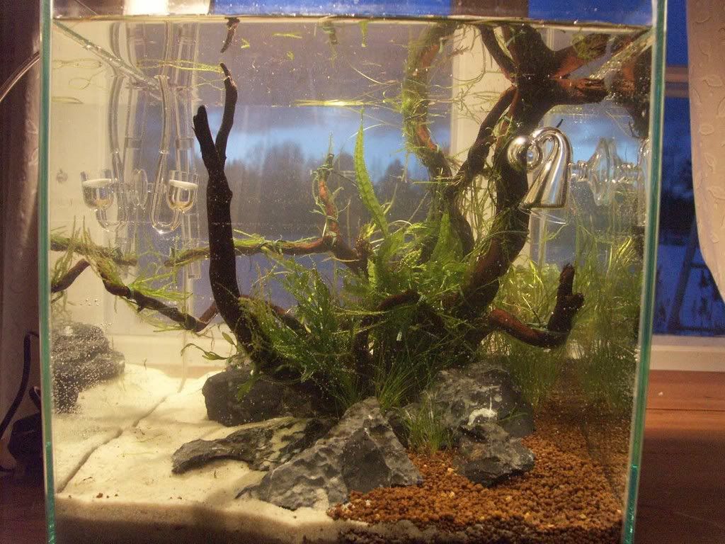 Är det stellator ,,samt hur klipper du ner dom och vilken del återanvänder du ?Ja det är Stellator. Jag brukar köra med ett bra trick jag verkligen gillar ;) Jag släpper upp dem i ytan nära ljuset och "bränner" fram den rosa färgen (http://www.bluesboy.se/viewimage.php?id=570). Sedan knipsar jag av dem på mitten (ca) och planterar ner toppen i gruset. Stubben kastar jag, eller i vissa fall får den stå kvar och generera fler grenskott. Att de aldrig hinner bilda rötter är ännu ett bevis på att växter sällan behöver dem ;) Det roliga är att när de väl har fått den rosa färgen behåller de den så länge CO2:n är bra - oavsett planteringsdjup.