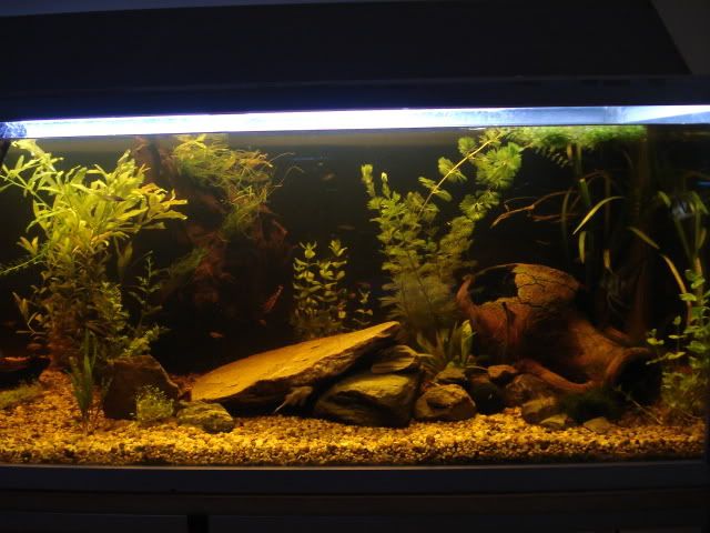 Ja här sitter man, ca 10 år sedan jag pysslade med akvarium sist, och nu har jag ett nystartat i vardagsrummet. Det passar bättre än perfekt mot den tidigare tomma väggen, som en helt egen levande tavla!